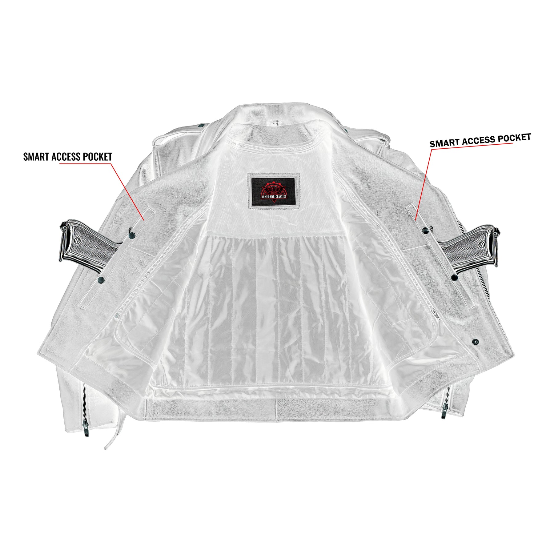 2 upgraded style concealed gun pockets between the snap and the zipper made of special heavy duty textile with built-in holsters and snap closure.
