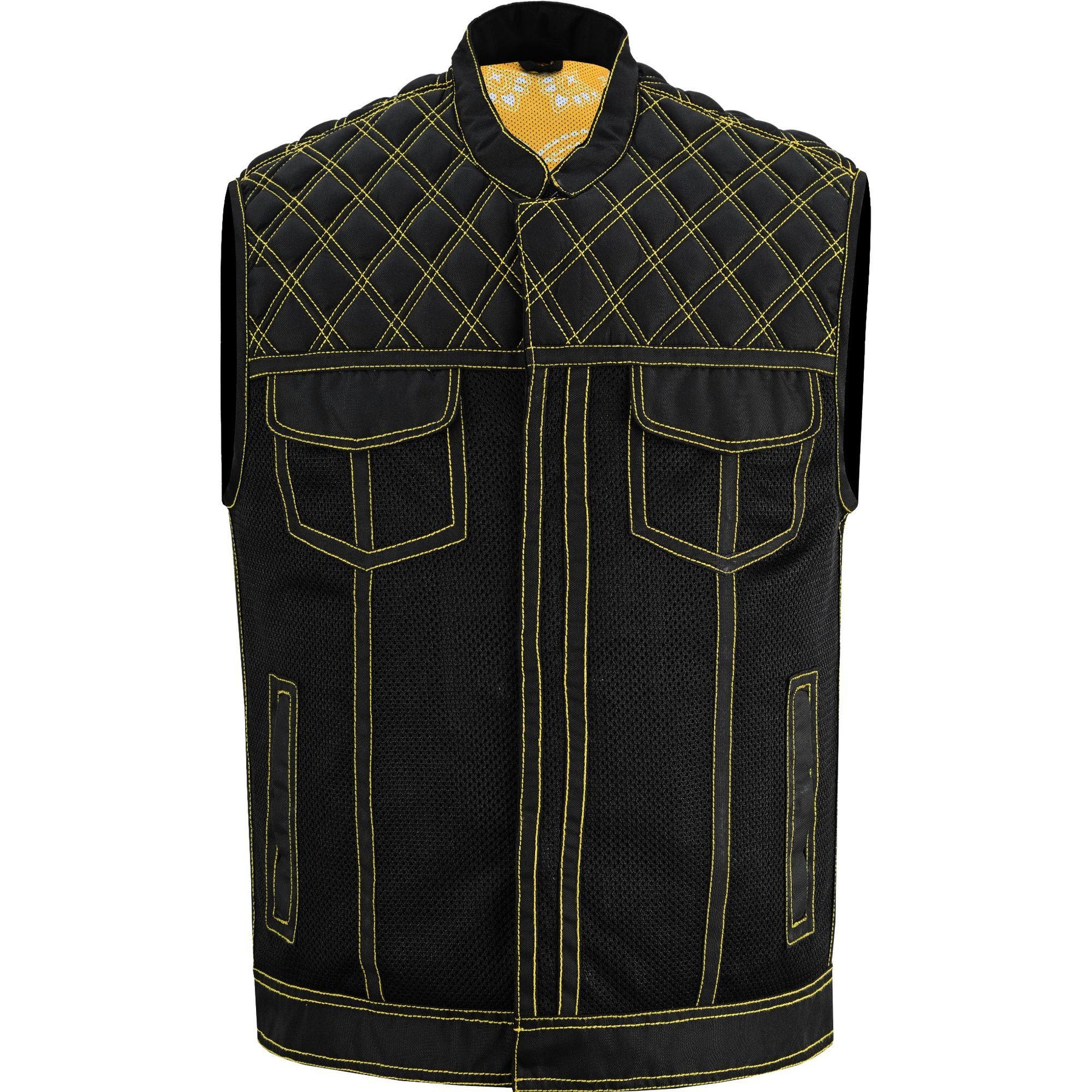 Sharp, fast, and built to breathe — the Iron Venom Mesh Vest takes club style into high voltage territory. Cut from premium mesh with reinforced quilting, it’s designed for riders who want airflow without losing attitude. Black and yellow detailing hits hard on the outside, while a paisley sublimated liner keeps the inside just as bold.