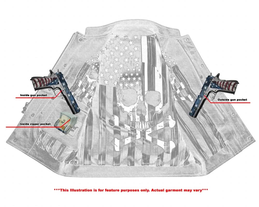 2 upgraded style concealed gun pockets between the snap and the zipper made of special heavy-duty textile with built-in holsters and snap closure.