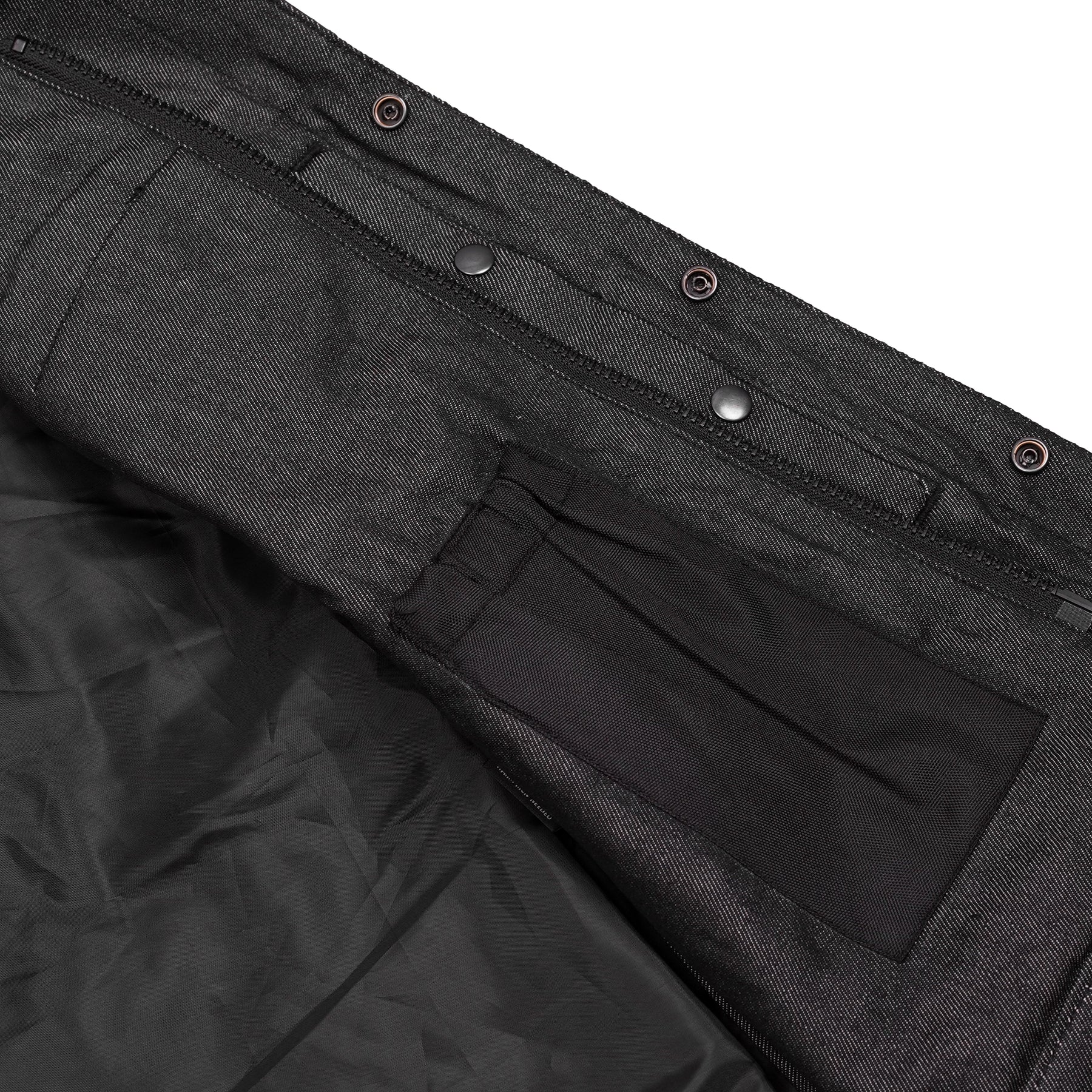 Front # 10 black metal zipper hidden under snap-placket blocks wind & rain.