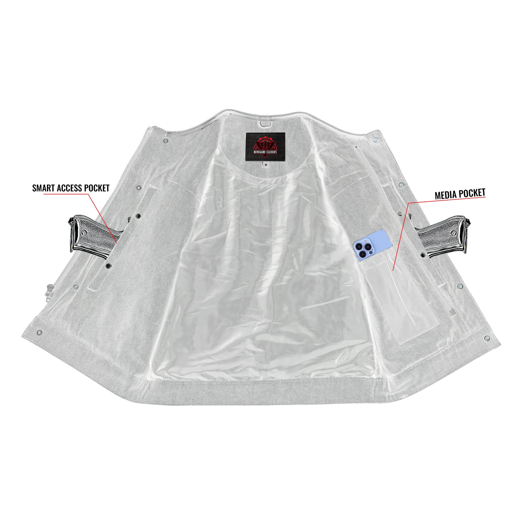 2 upgraded style concealed gun pockets between the snap and the zipper made of special heavy duty textile with built-in holsters and snap closure.