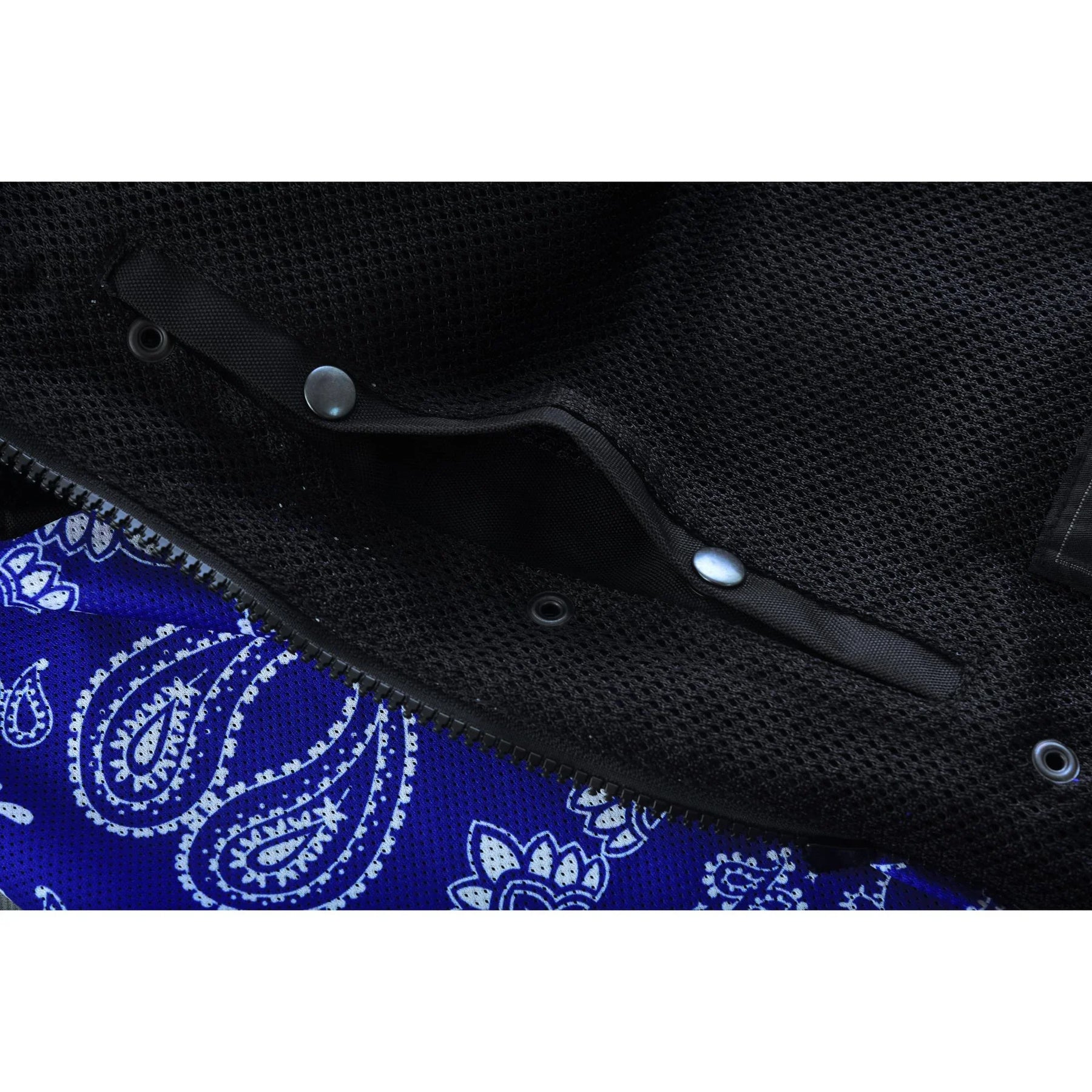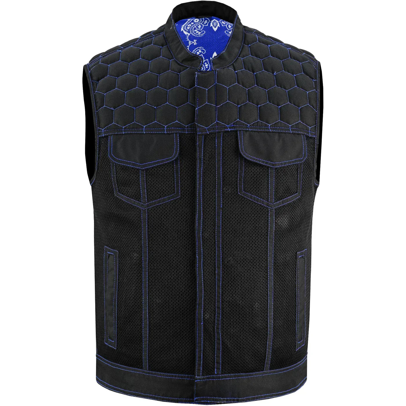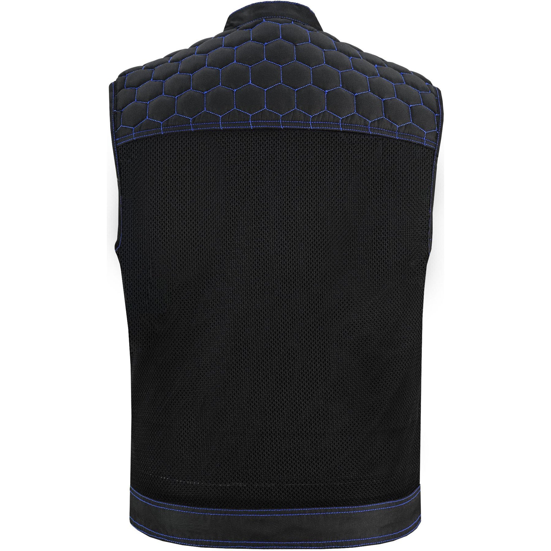 Our Blue Soul Black and Blue Mesh Textile Vest features a durable mesh construction with vibrant black accents. It includes concealed carry and secure chest pockets with snap button closures for convenience. The hidden front zipper with snap-placket reinforced stitching and built-in hanging loop adds to its practicality and style. This vest is perfect for those who want a striking, functional Vest to match their riding styles.