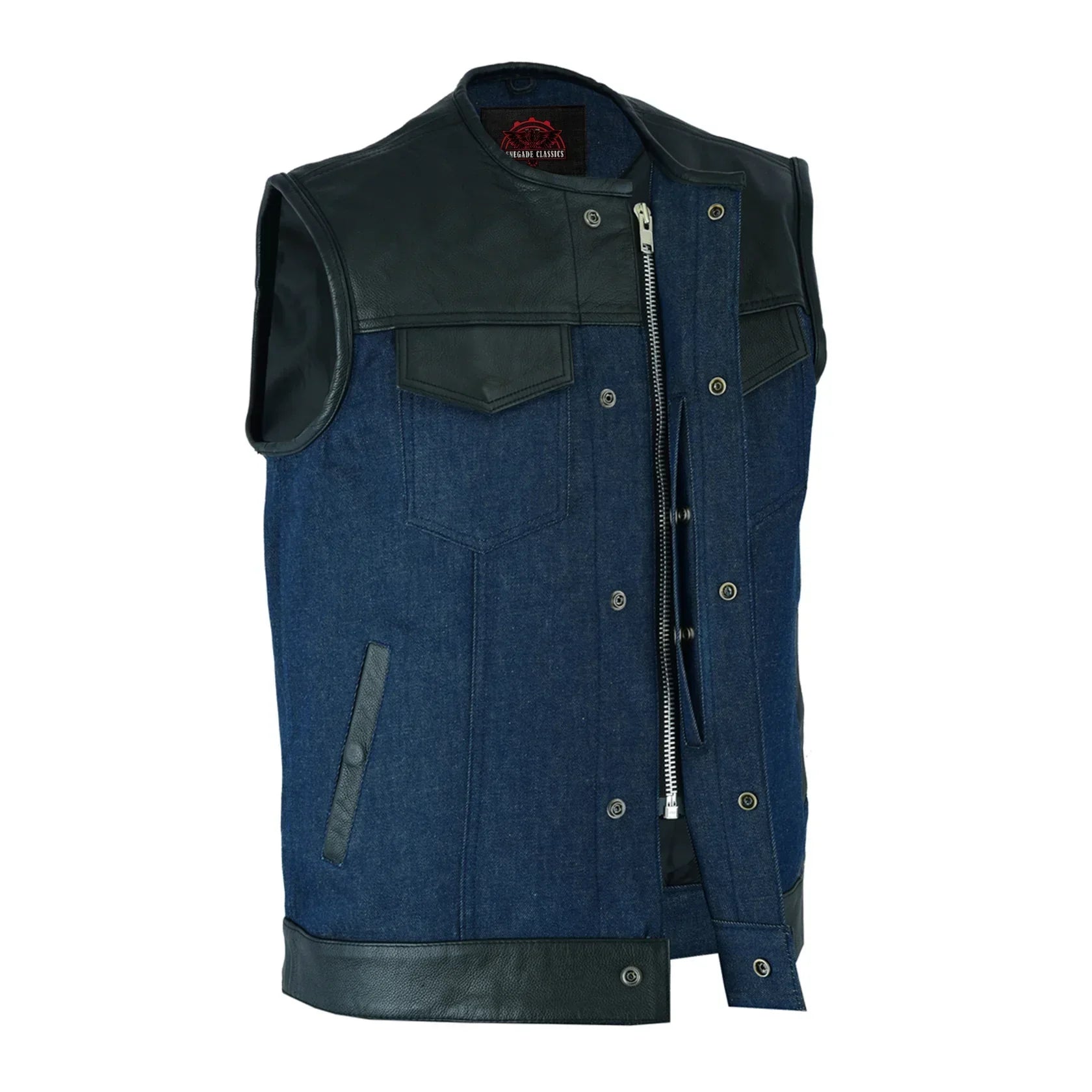 Blueburn Men's Leather & Denim Combo Motorcycle Vest (Black/Broken Blue)