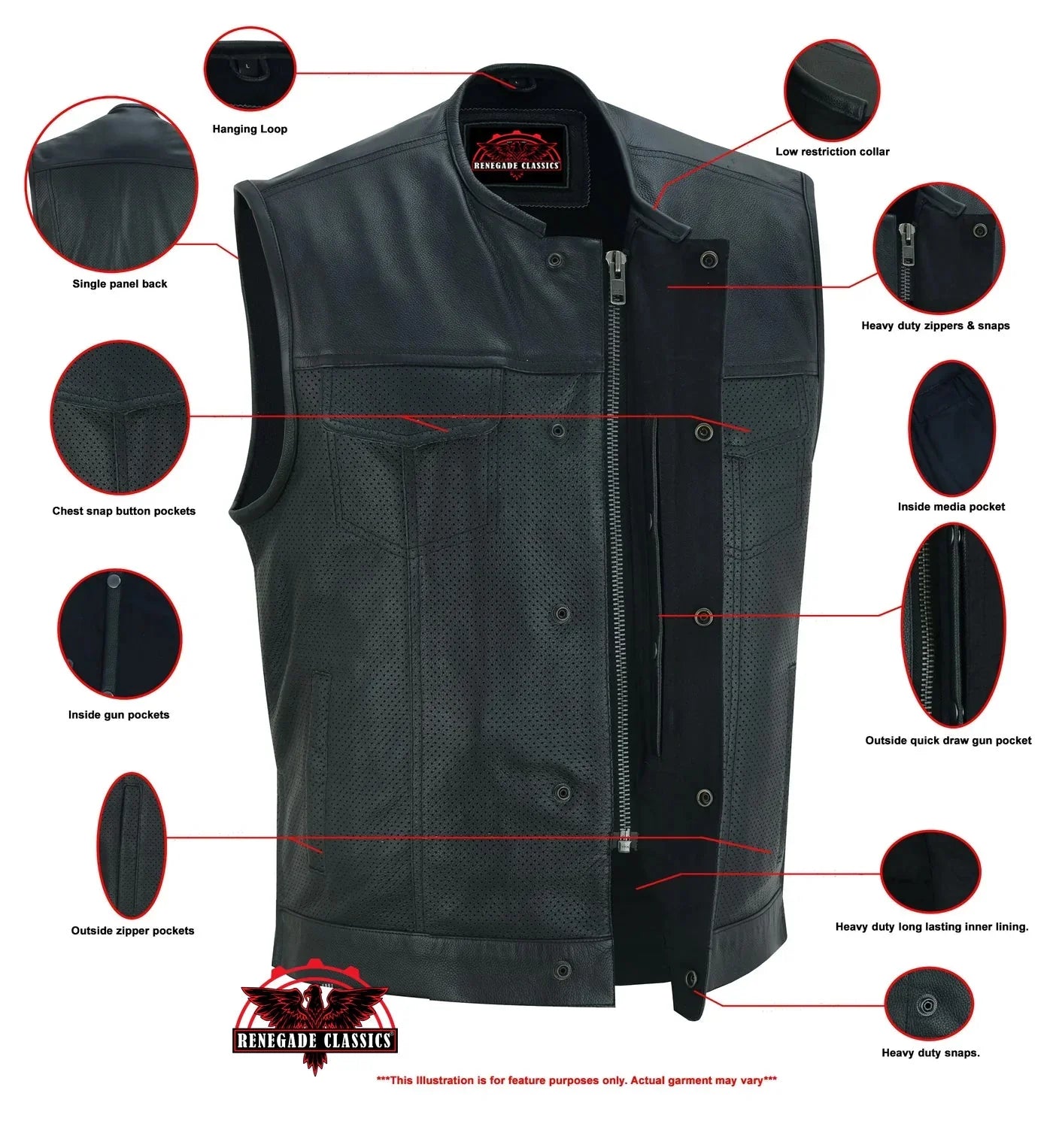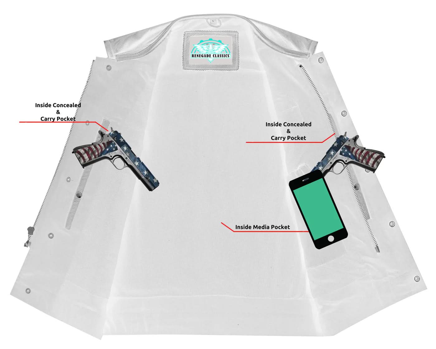 The concealment pockets are located between the snap and zippers for extra security. They are made from durable textile and contain holsters and snap closures. You can ride safely with our men's perforated single back panel concealment vest.