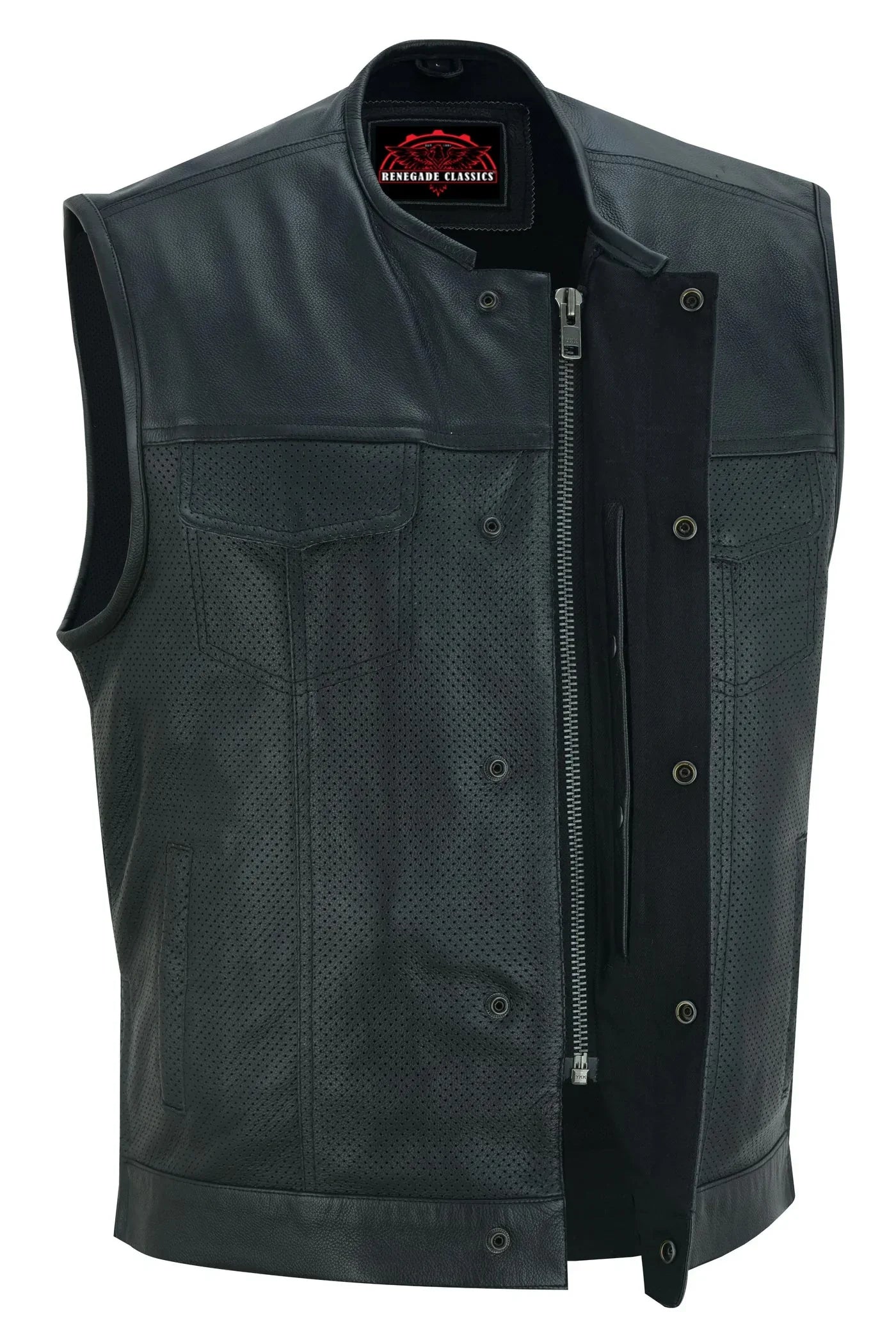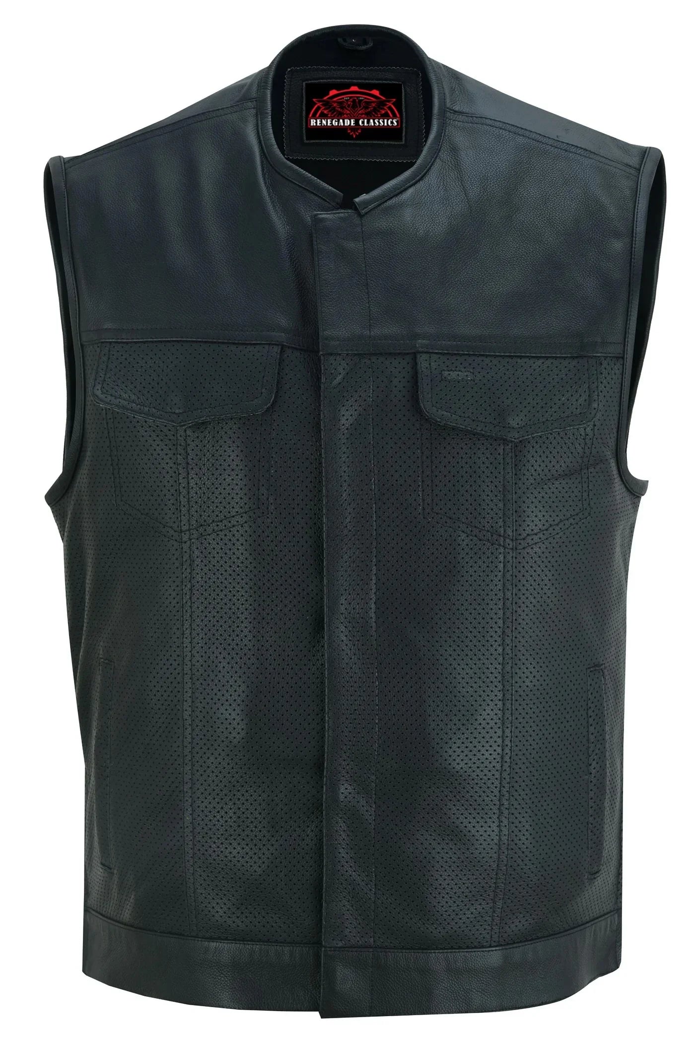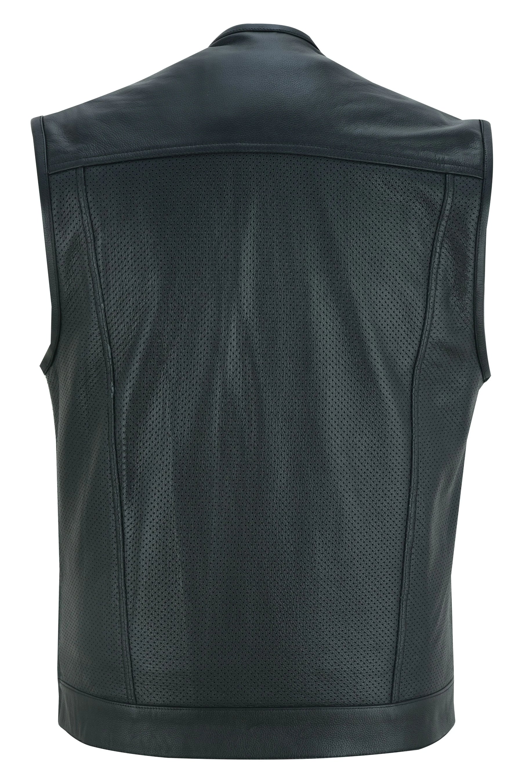 If you're looking for a men's single back panel concealment vest without a collar, we have you covered. Our collarless, perforated vest is made from soft, premium drum-dyed cowhide for comfort and durability. The single-panel back is customizable with patches or airbrushed artwork.