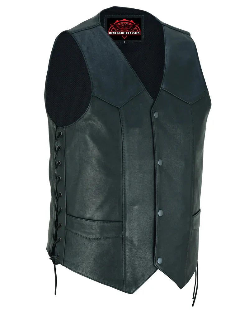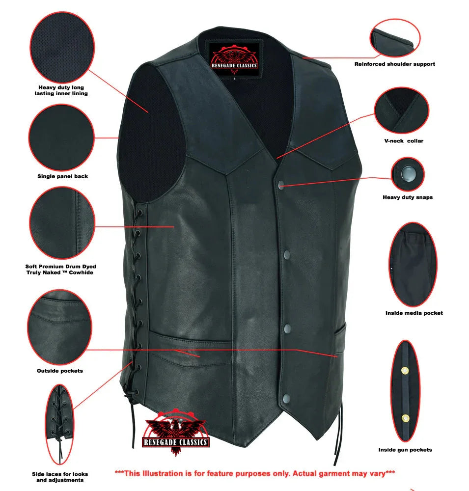 The Guild Gold Men's Leather Motorcycle Vest - Black delivers a bold, classic biker look with its V-neck design, side lacing, and premium milled cowhide. Built for comfort and durability, it features a heavy-duty liner and reinforced stitching, ensuring it holds up to the demands of the road. With multiple pockets, including smart access and a dedicated cell phone pocket, it’s as practical as it is stylish. The single-panel back makes it perfect for custom patches, while YKK zippers and heavy-duty snaps add lasting strength. Whether you're cruising or making a statement, this vest is ready for the ride. Soft Premium Drum Dyed Truly Naked Cowhide 1.3 - 1.4mm Thick Leather.