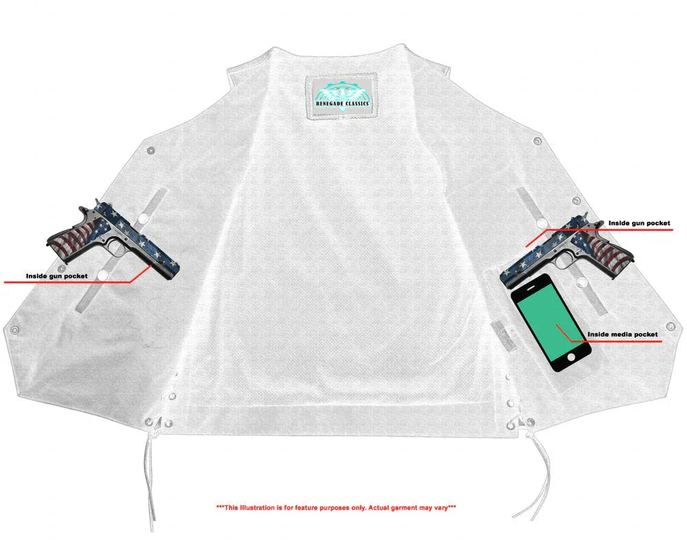 • 2 inside concealed gun pockets made of special heavy-duty textile with built-in holsters and snap closure.