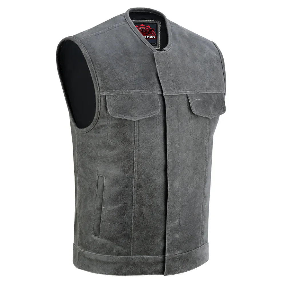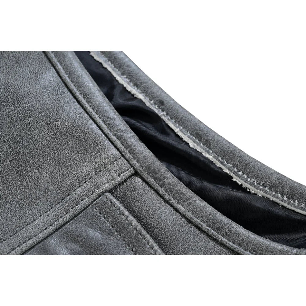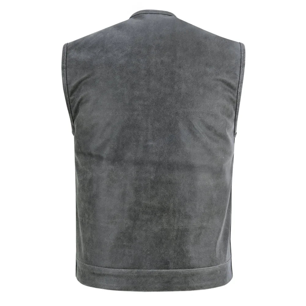 The Rough Cut leather vest is the ultimate statement of versatility. Our men’s single-panel concealment biker vest, stripped of a collar for a bold, streamlined edge, is crafted from soft, premium drum-dyed gray cowhide (1.2 - 1.3mm). This rugged leather moves with you, offering comfort and protection against wind and rain thanks to its hidden zipper. Ready for any season and perfect for layering, it’s designed for those who carry with confidence. Two concealed carry pockets, complete with holsters and snap closures, secure your weapon discreetly. Featuring a customizable single-panel back, durable interior lining, and a secret cellphone pocket, this vest is built to dare.