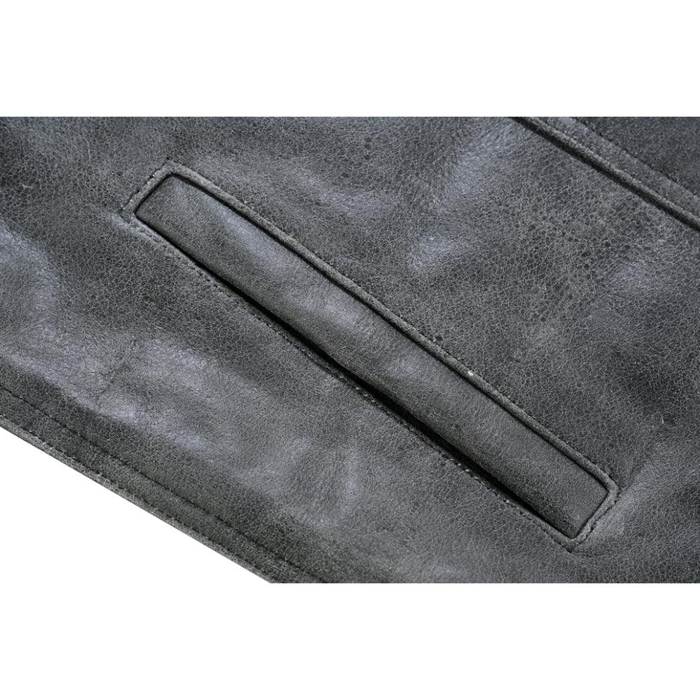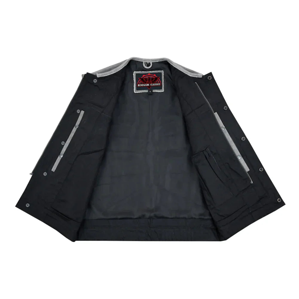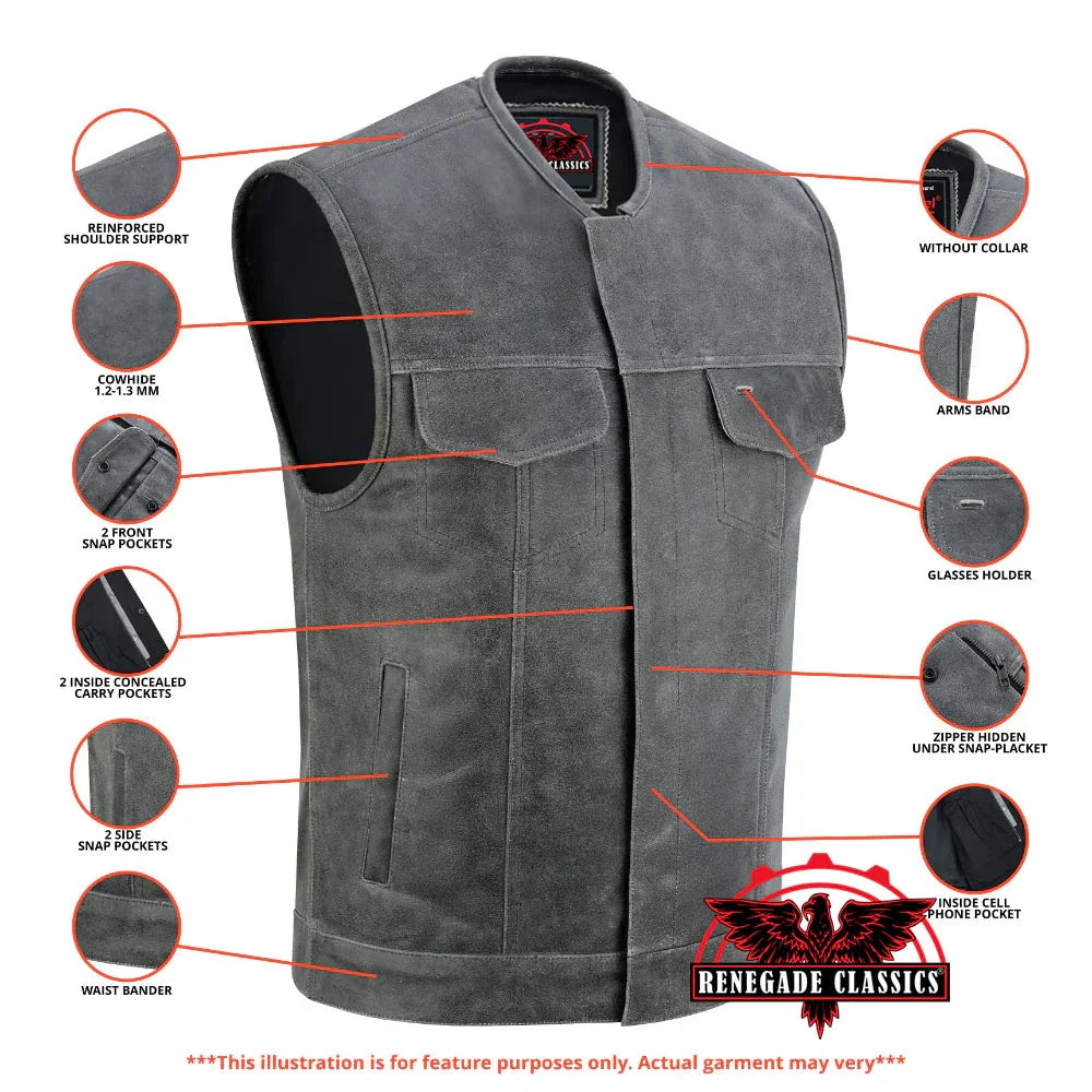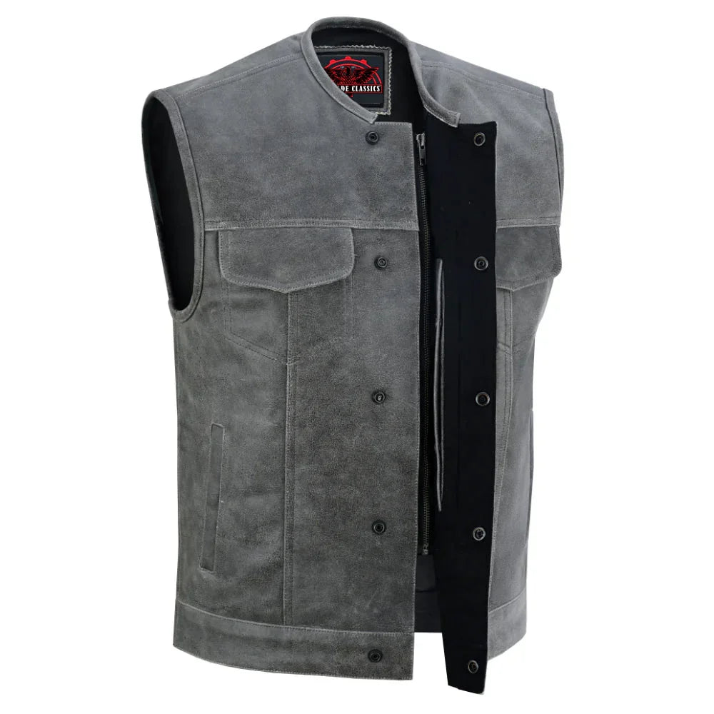 The Rough Cut leather vest is the ultimate statement of versatility. Our men’s single-panel concealment biker vest, stripped of a collar for a bold, streamlined edge, is crafted from soft, premium drum-dyed gray cowhide (1.2 - 1.3mm). This rugged leather moves with you, offering comfort and protection against wind and rain thanks to its hidden zipper. Ready for any season and perfect for layering, it’s designed for those who carry with confidence. Two concealed carry pockets, complete with holsters and snap closures, secure your weapon discreetly. Featuring a customizable single-panel back, durable interior lining, and a secret cellphone pocket, this vest is built to dare.