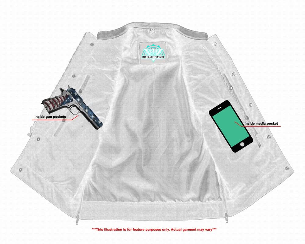 2 upgraded style concealed gun pockets between the snap and the zipper made of special heavy-duty textile with built-in holsters and snap closure.