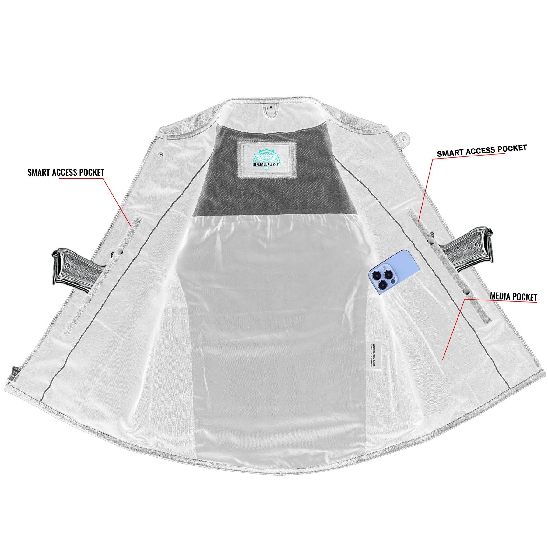 • Two concealed carry pockets with holsters and snap closures.