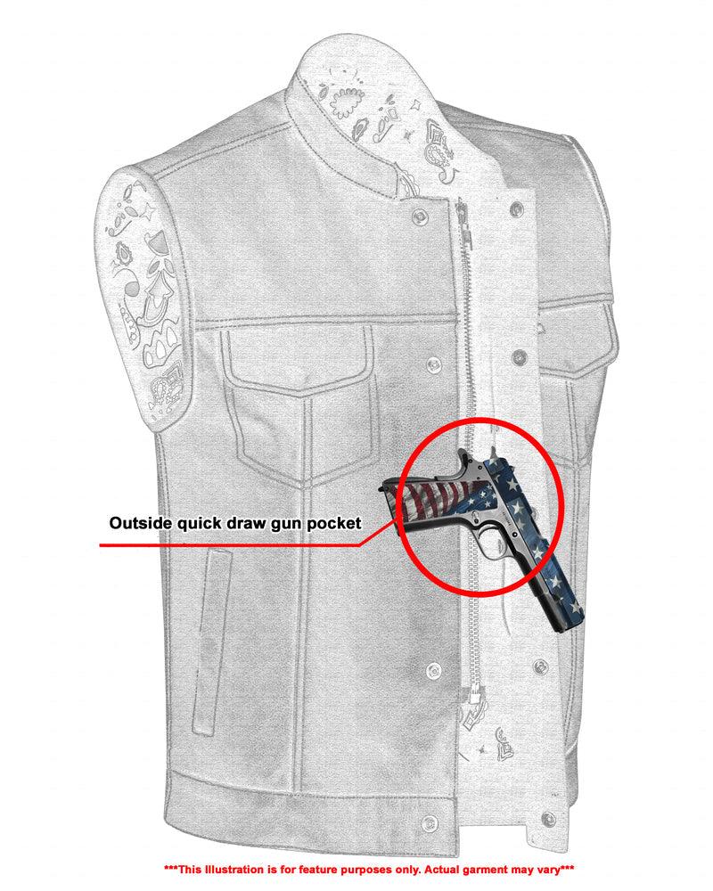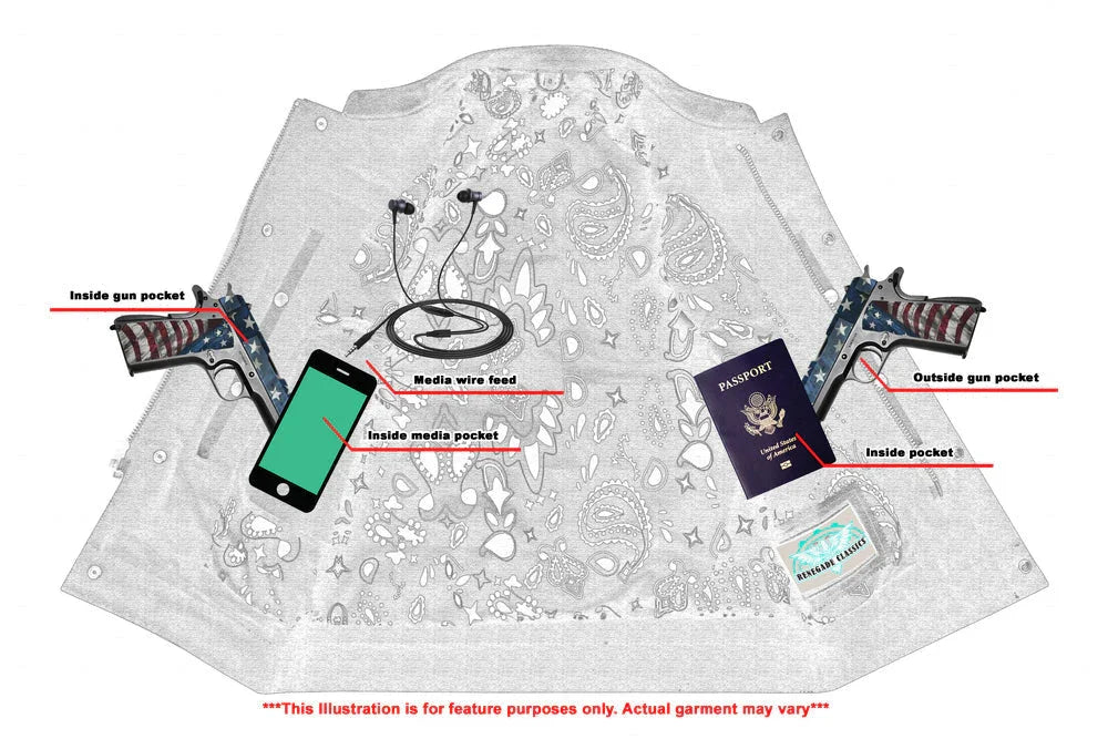 • 2 upgraded style concealed gun pockets between the snap and the zipper made of special heavy-duty textile with built-in holsters and snap closure.