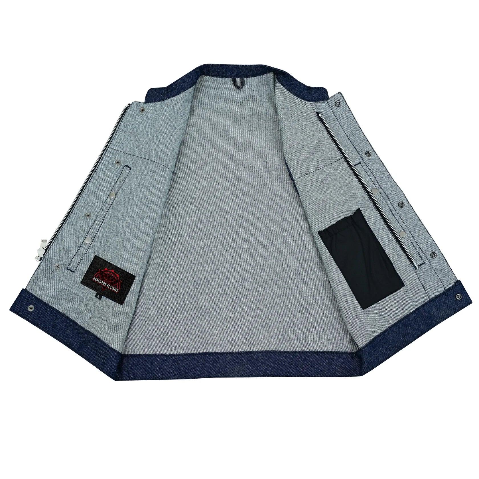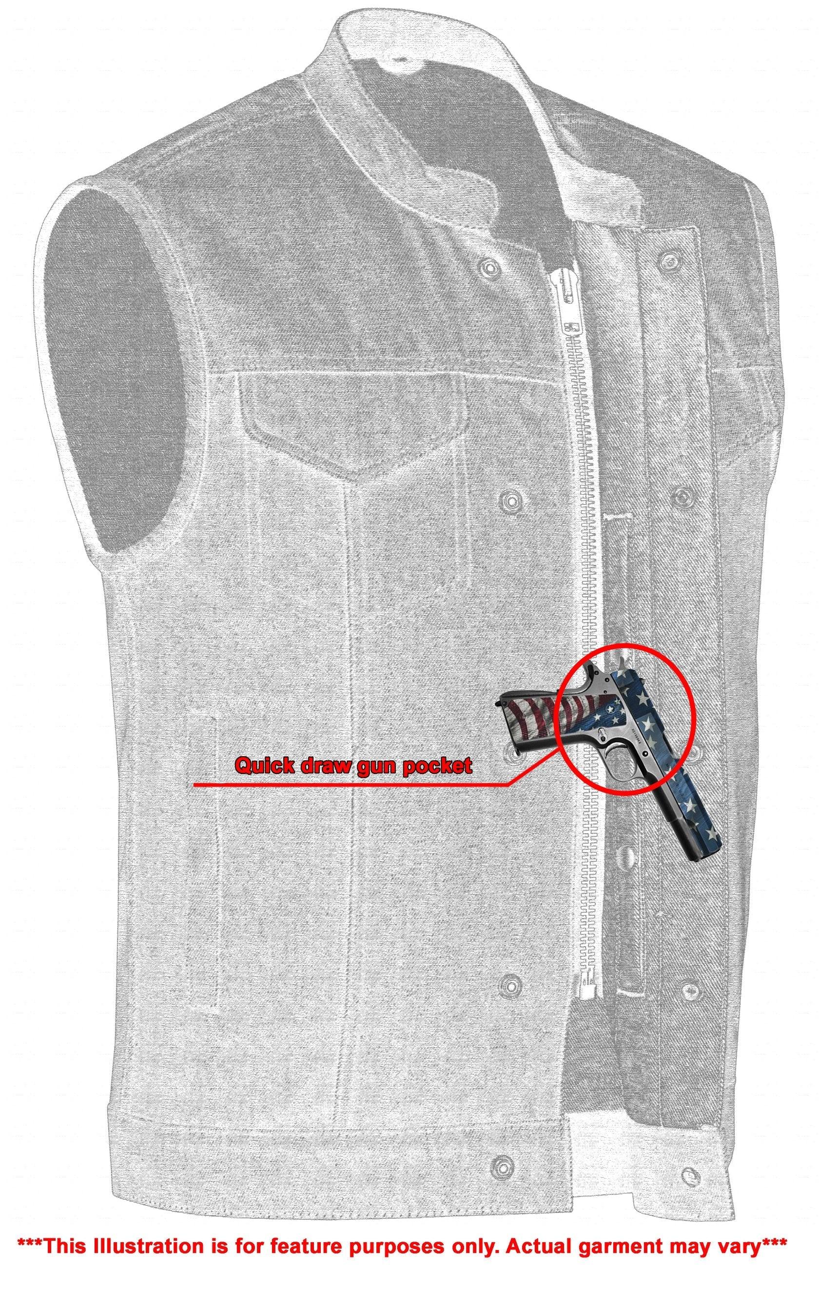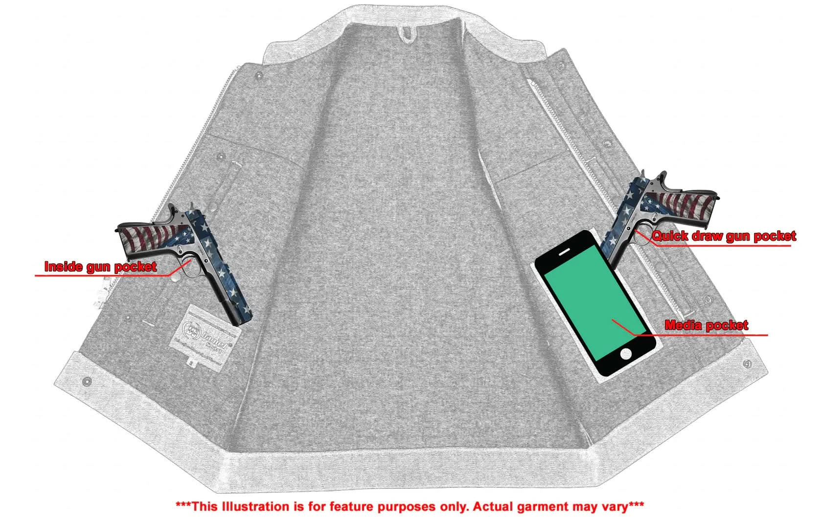 2 upgraded style concealed gun pockets. One between the snap and the zipper. Both made of special heavy-duty textile with built-in holsters and snap closure.