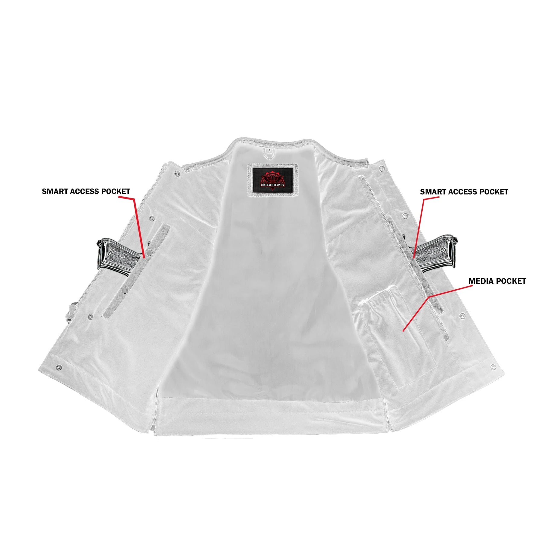 2 upgraded style concealed gun pockets between the snap and the zipper made of special heavy-duty textile with built-in holsters and snap closure.