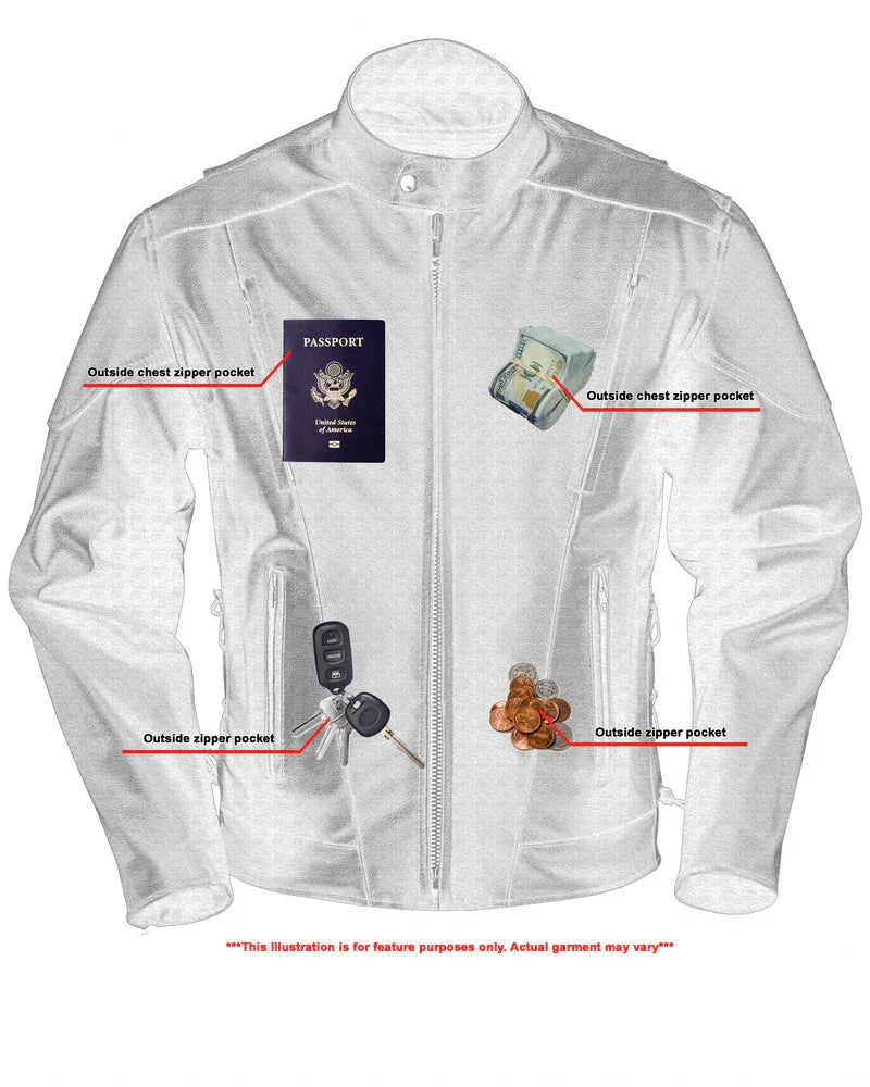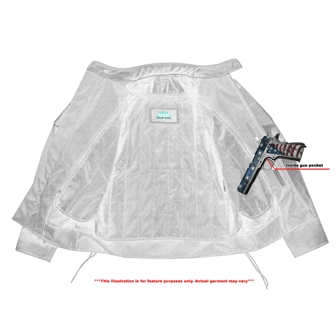 • 1 inside left-hand side concealed Smart Access Pocket made of special heavy-duty textile with built-in holsters and snap closure.
