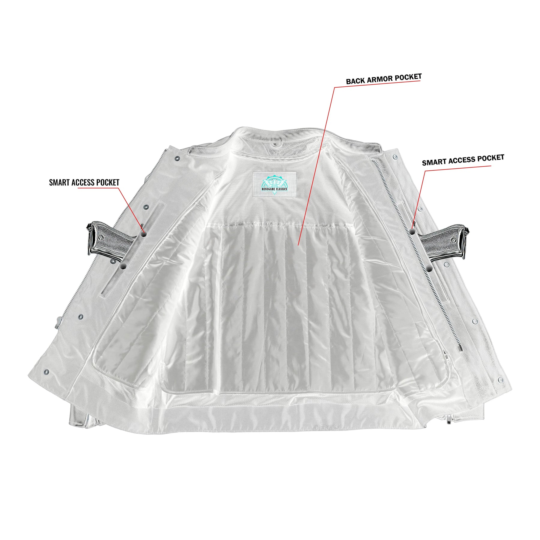 Crafted from soft, premium drum-dyed naked cowhide (1.2–1.3mm), this black utility motorcycle jacket is your ride’s best sidekick. A sturdy #10 black metal zipper hides behind a snap-placket to keep wind and rain at bay. It boasts a sneaky 16-pocket system, including two upgraded concealed gun pockets made from tough textile with built-in holsters and snap closures—because you never know. Reinforced shoulders hide your gear like a pro, while side zippers add comfort on the move. With chest and back vents, a zip-out insulated liner, stretch panels, and armor pockets, this jacket rides as hard as you do.