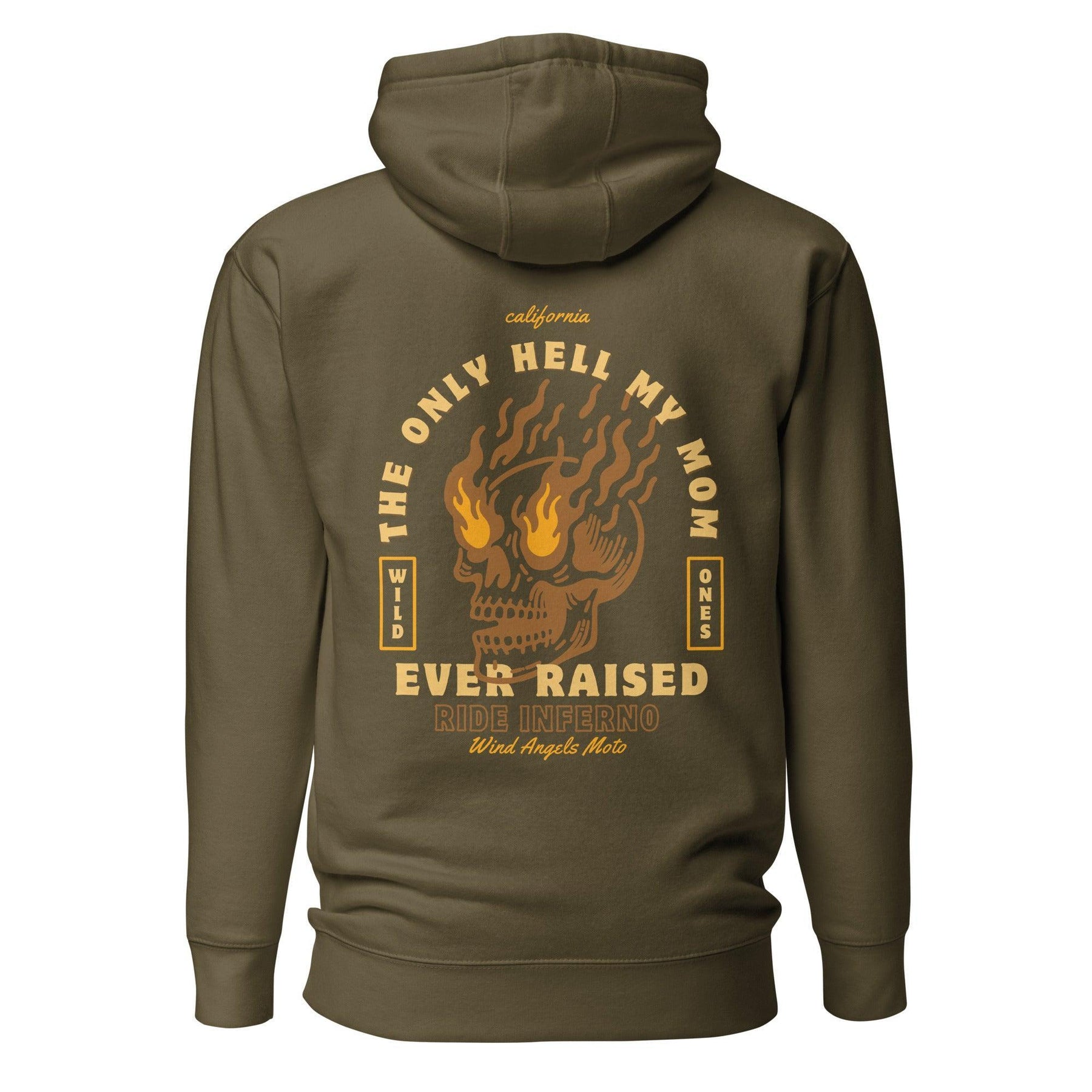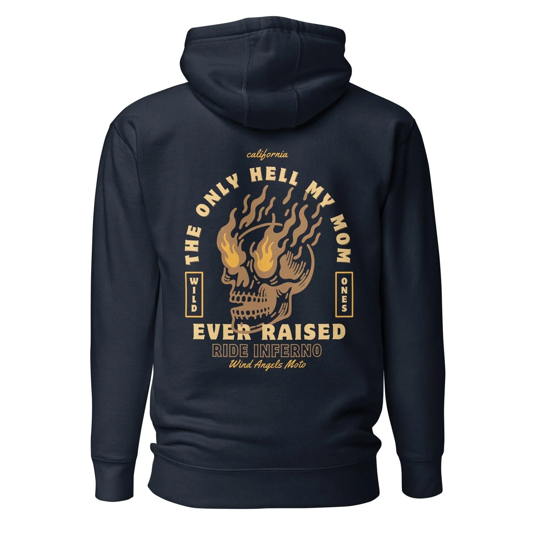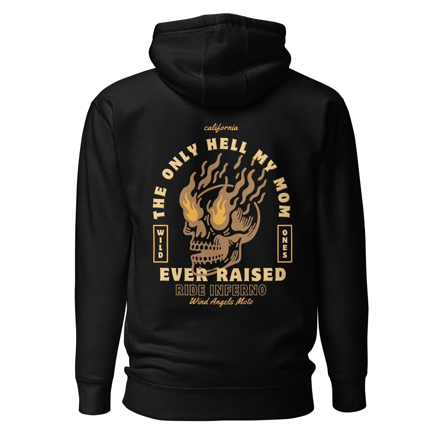 Front: Sleek and stealthy, like you rolling up to a stoplight. Back: Bold proclamation - "The only hell my momma ever raised, Ride Inferno" (Because let's face it, you're probably her favorite mistake)