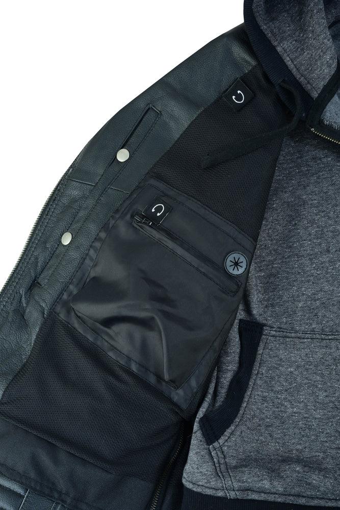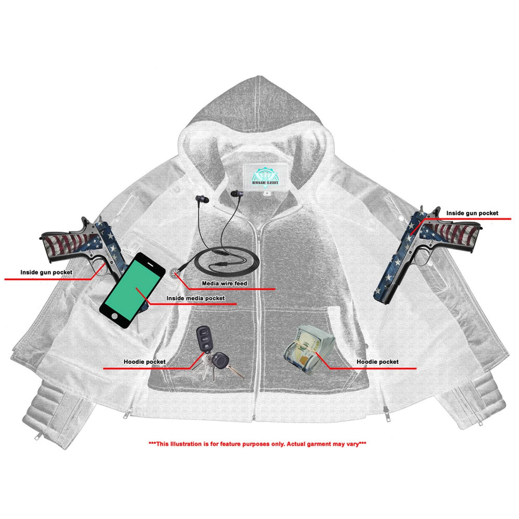 2 inside concealed gun pockets made of special heavy duty textile with built-in holsters and snap closure.