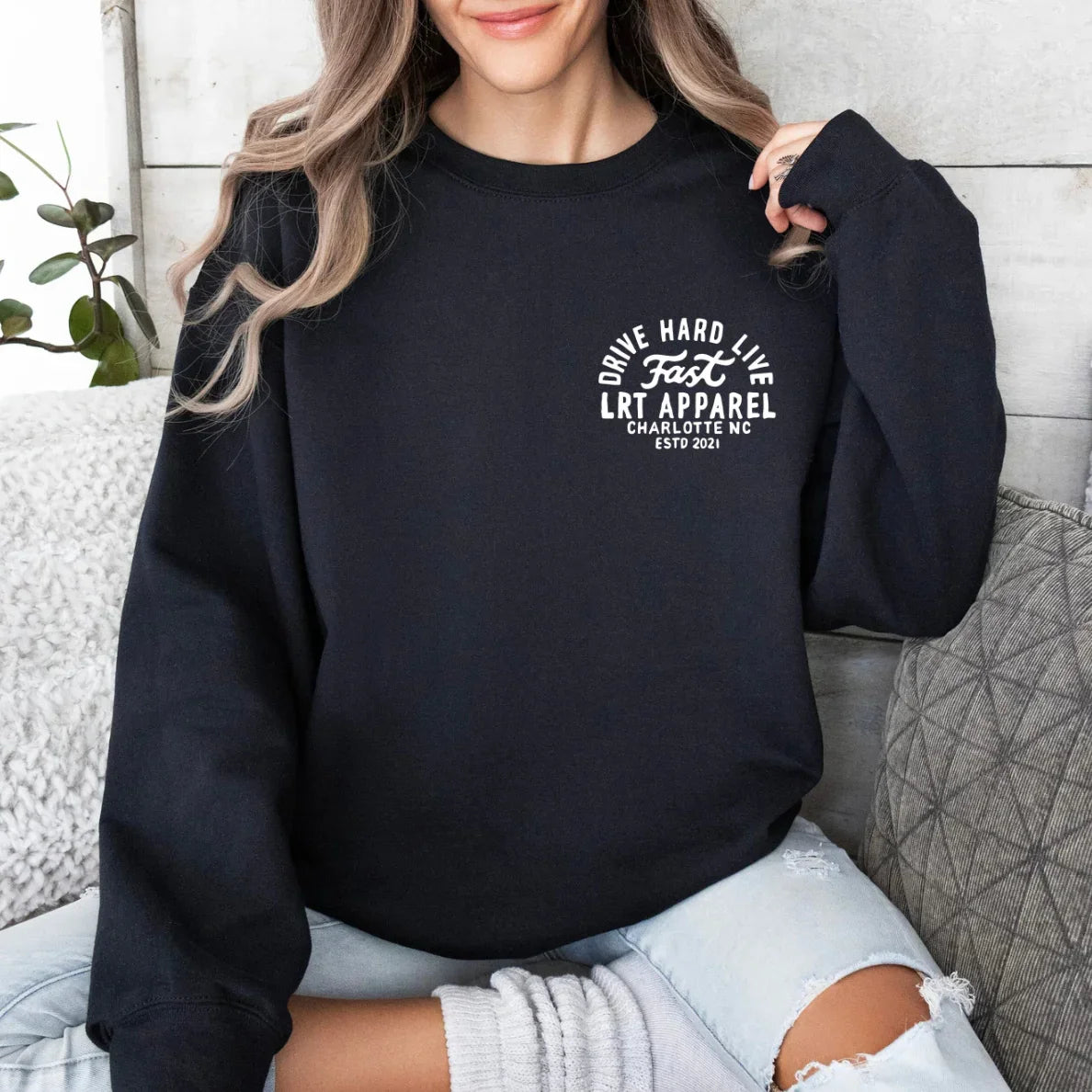 Rev up your wardrobe with the Apex Crewneck - a nostalgic tribute to classic racing culture. This premium blend sweatshirt combines the rugged spirit of vintage motorsports with contemporary comfort, featuring our iconic "DRIVE HARD LIVE FAST" graphic that speaks to the speed demon in everyone.