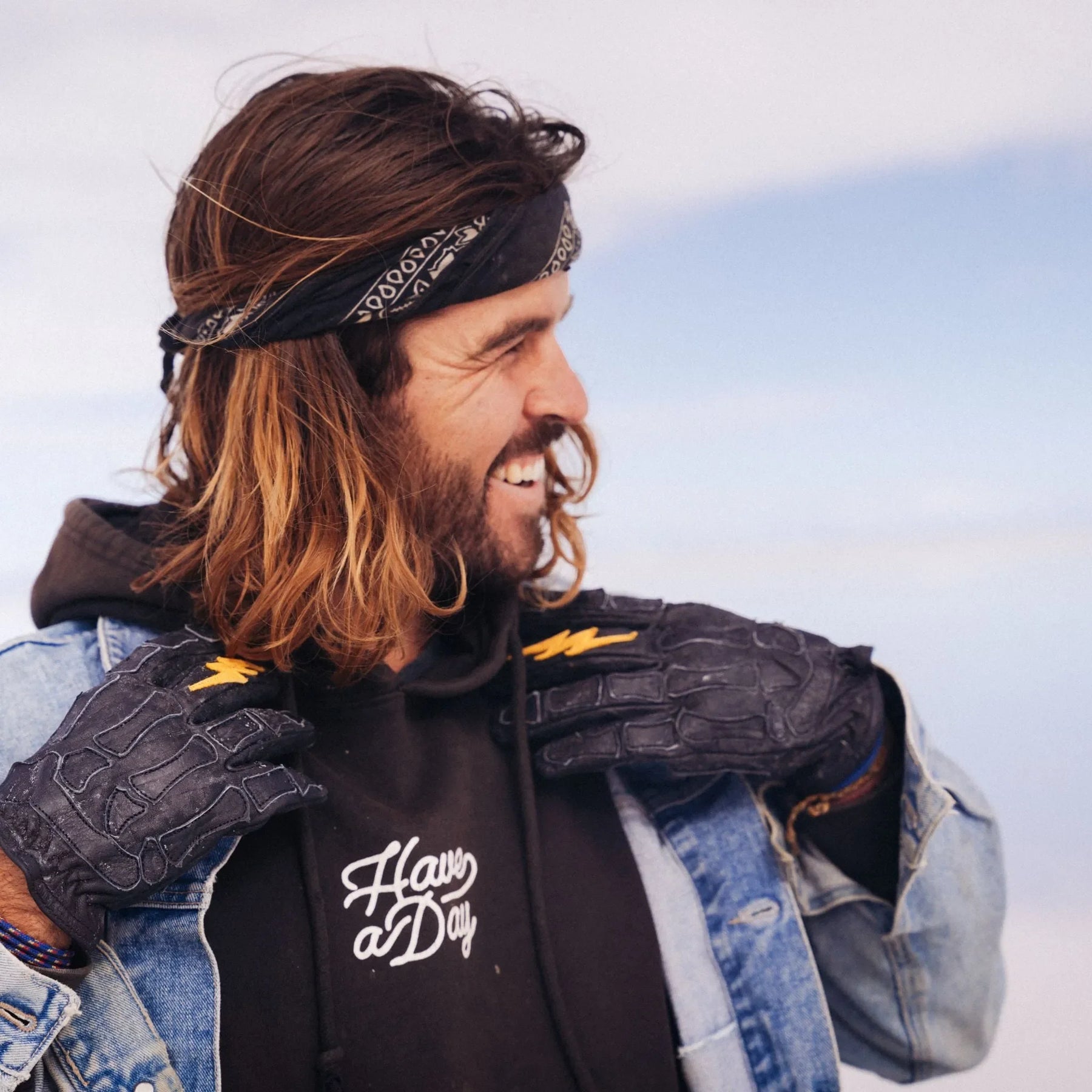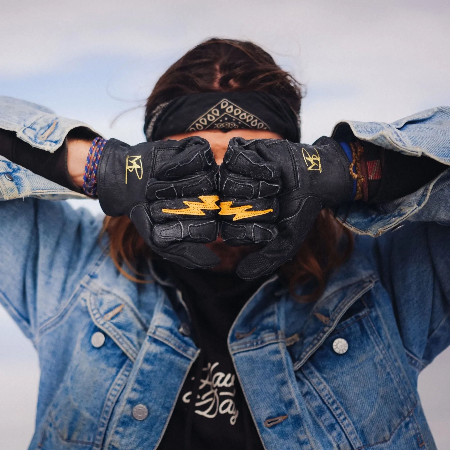 The Black Skeleton Astrapi, a blend of HANDCRAFTED ARTISTRY and ROBUST DURABILITY. Made from full grain Water Buffalo hide, this glove holds the promise of exceptional strength. The glove shapes to your hand, offering a CUSTOM-FIT COMFORT. It boasts a gold lightning bolt, meticulously hand-stitched with 40 pieces of buffalo leather, embodying the strength of astrapi (lightning in Greek). The index finger comes with a tech fabric for SMARTPHONE COMPAT