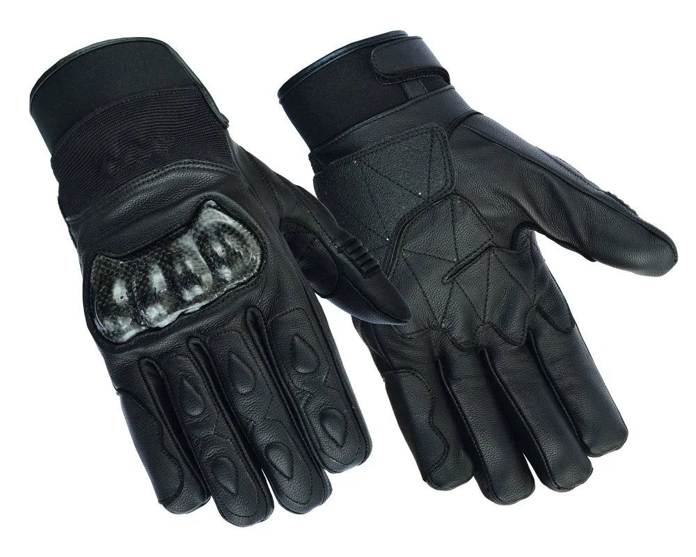 Textile and leather glove made with premium grade durable Aniline goat featuring hard knuckles, touch screen finger tips and adjustable wrist strap.