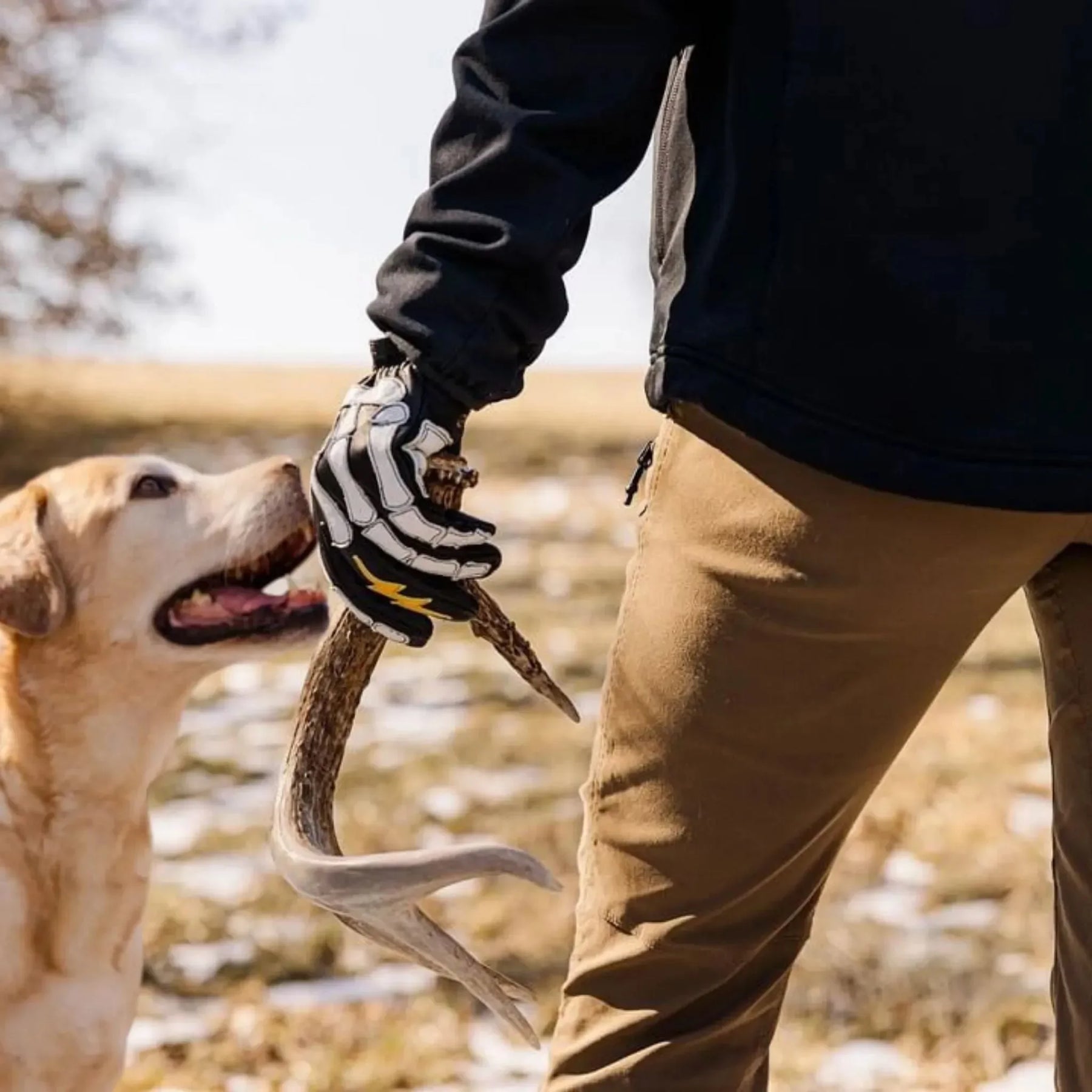 Introducing the Black Skeleton glove, a bold statement of HANDCRAFTED EXCELLENCE and STRENGTH. It boasts of an impressive construction using full grain Water Buffalo hide, ensuring the fibers are intact for MAXIMUM DURABILITY. This glove molds specifically to your hand, delivering a unique blend of COMFORT and USABILITY. With a striking aesthetic brought by 40 hand-stitched buffalo leather pieces, it’s not just a glove - it’s a style statement. And, thanks to the tech fabric stitched into the index finger, you can engage with tech devices seamlessly. Its water-friendly feature adds an extra touch of practicality, while its puncture, tear and abrasion resistance assure you a superior level of hand protection.