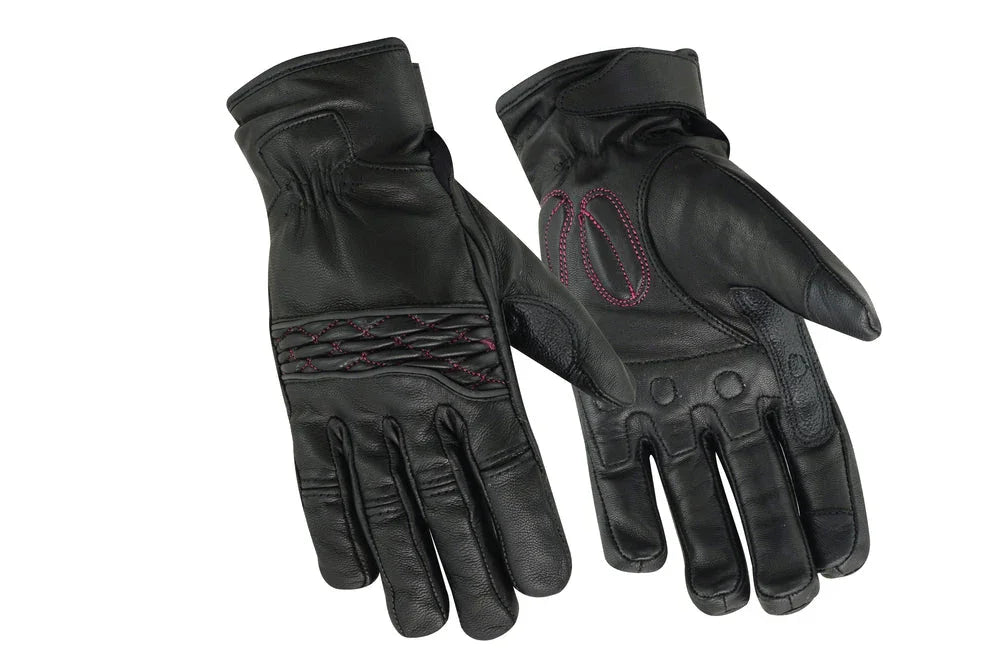 Women's glove made with premium grade durable Aniline goat featuring contrasting hot pink stitching, gel palm, touch screen finger tips, reflective piping, light lining and adjustable wrist strap.