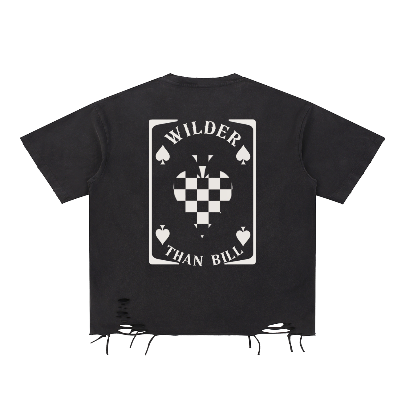The back hits harder than a well-placed boot: a bold playing card design with a black  upside-down checkered spade, a nod to gamblers, gunslingers, and anyone who knows luck favors the reckless. Soft enough to wear all day, tough enough to outlive trouble.