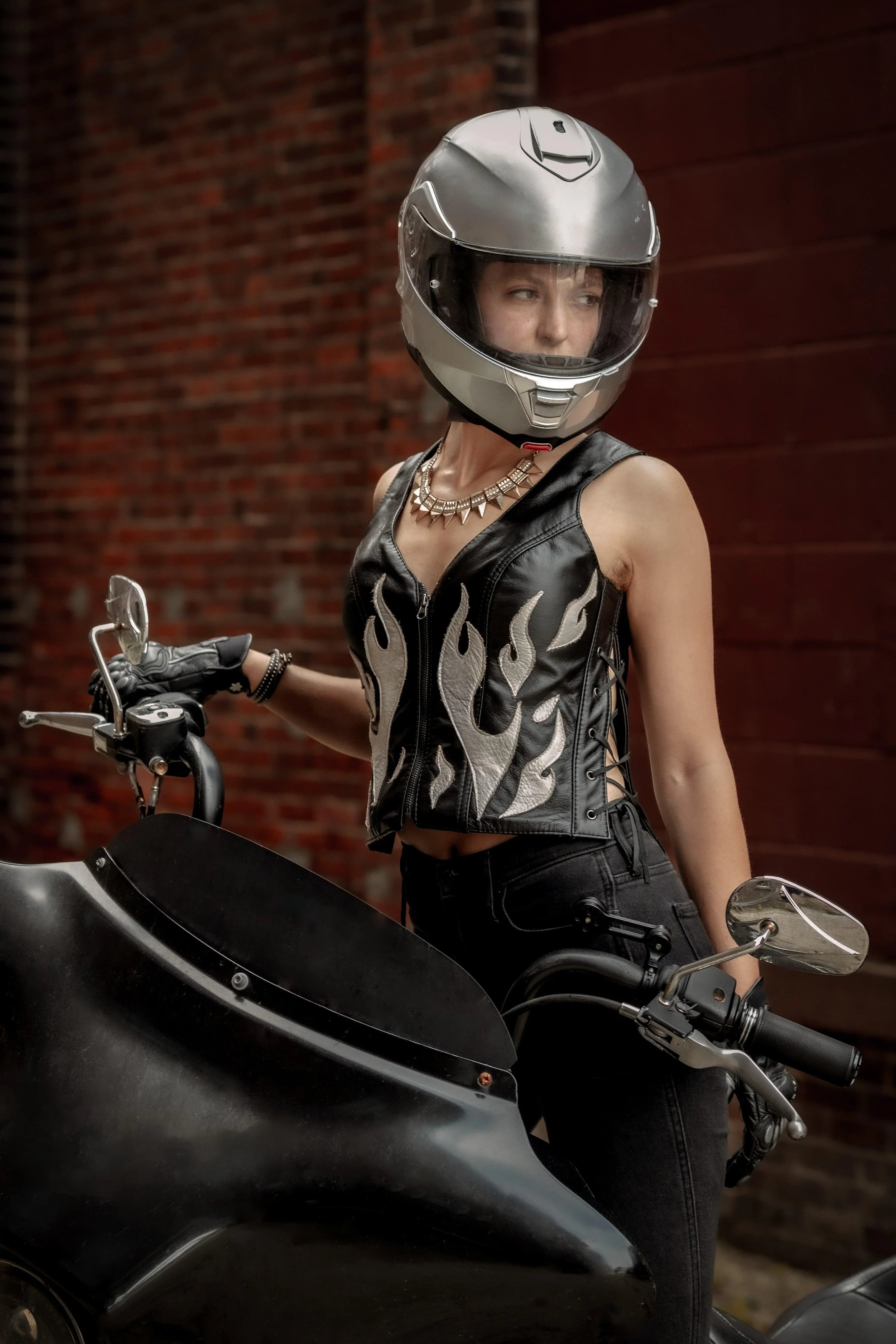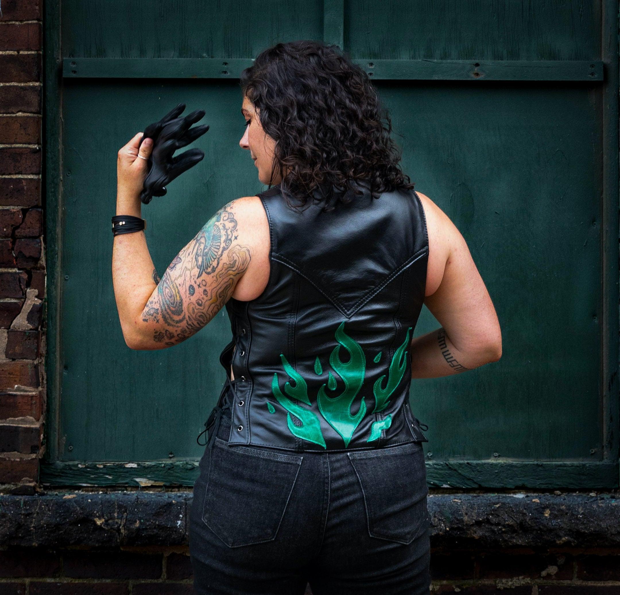 Using 100% recycled and repurposed leathers, every top is handmade to order by Gnykol. Lightweight black leather is meticulously constructed and embellished with your choice of one of five colored flames. Swooping neckline and structured bust accentuates and supports while lace-up side panels give a custom and comfortable fit. Complete with gun metal front zip and grommet details. Fully lined with breathable lyocell - a plant based super-soft alternative to polyester. All tops are handmade by the artist and made to order. Flame colors have a limited supply!
