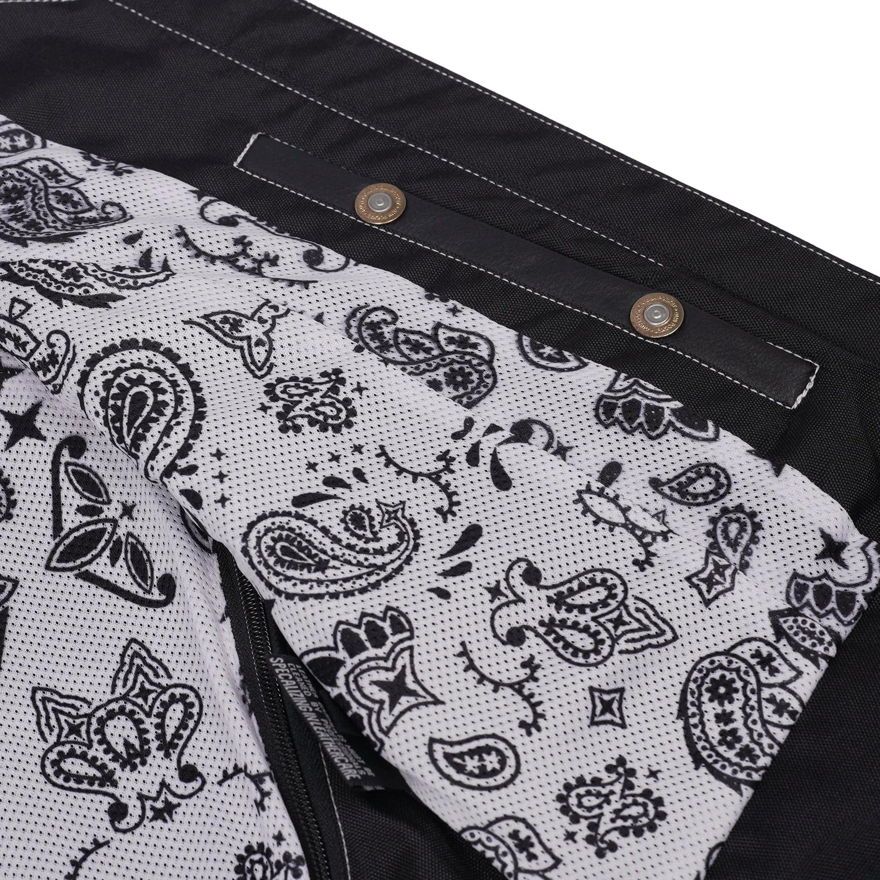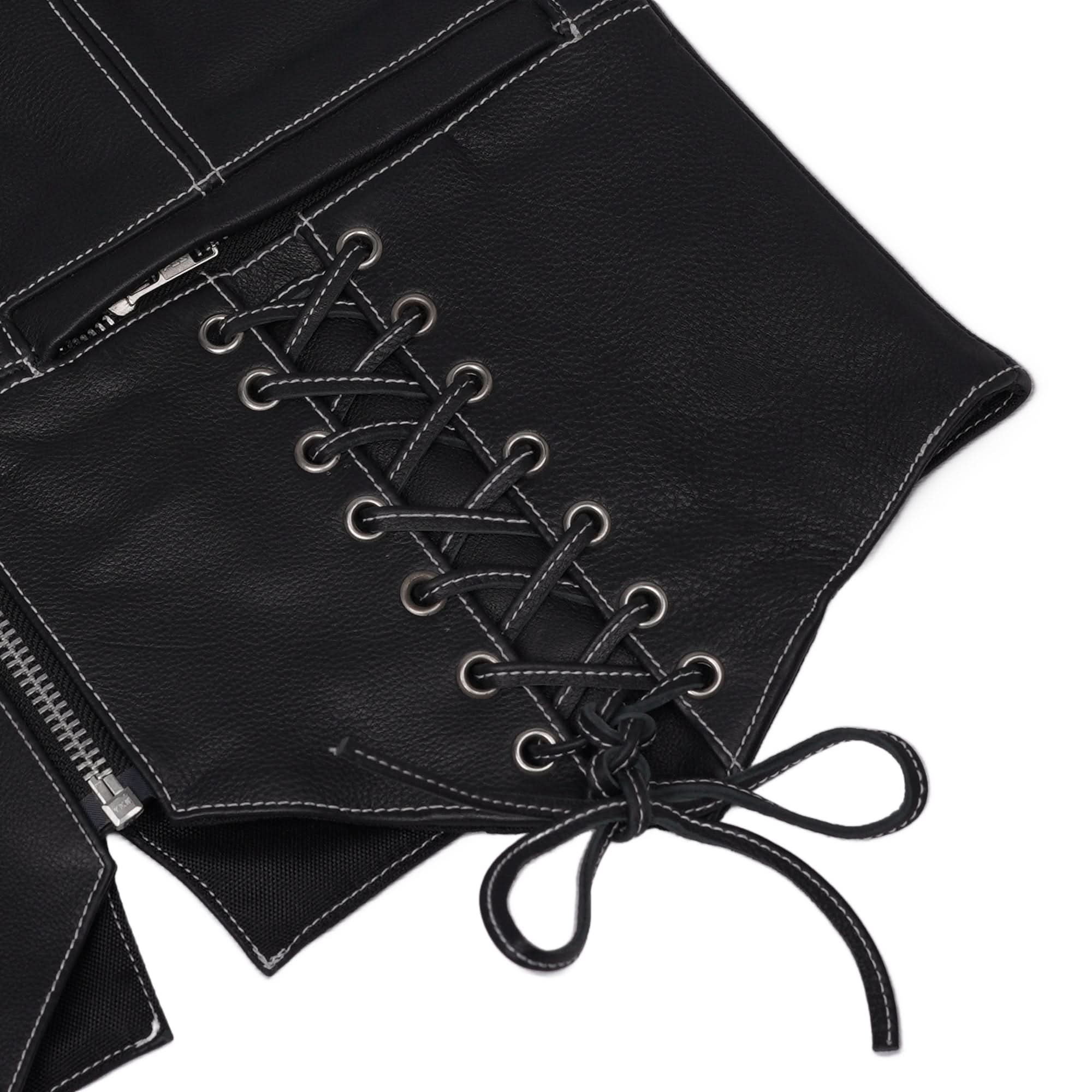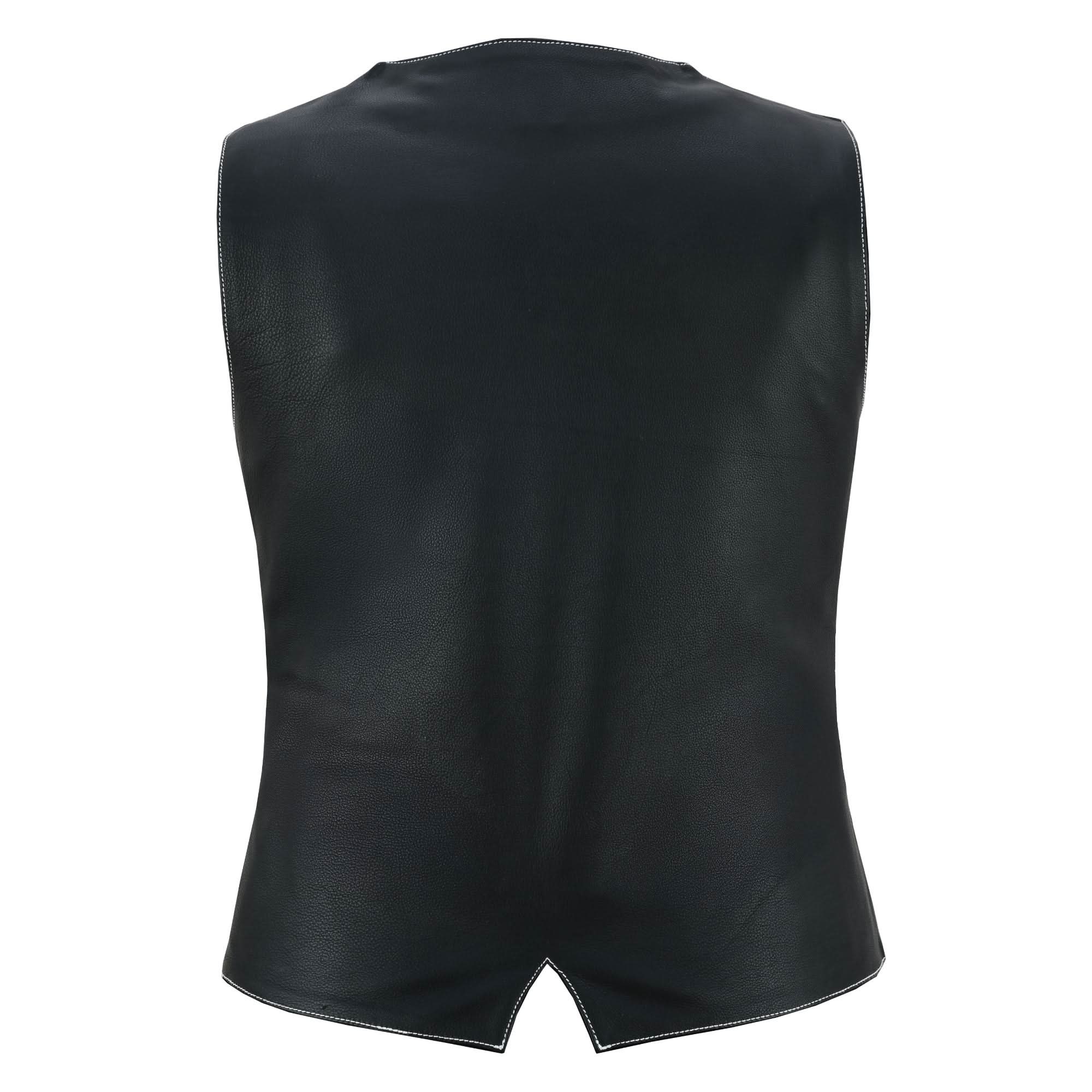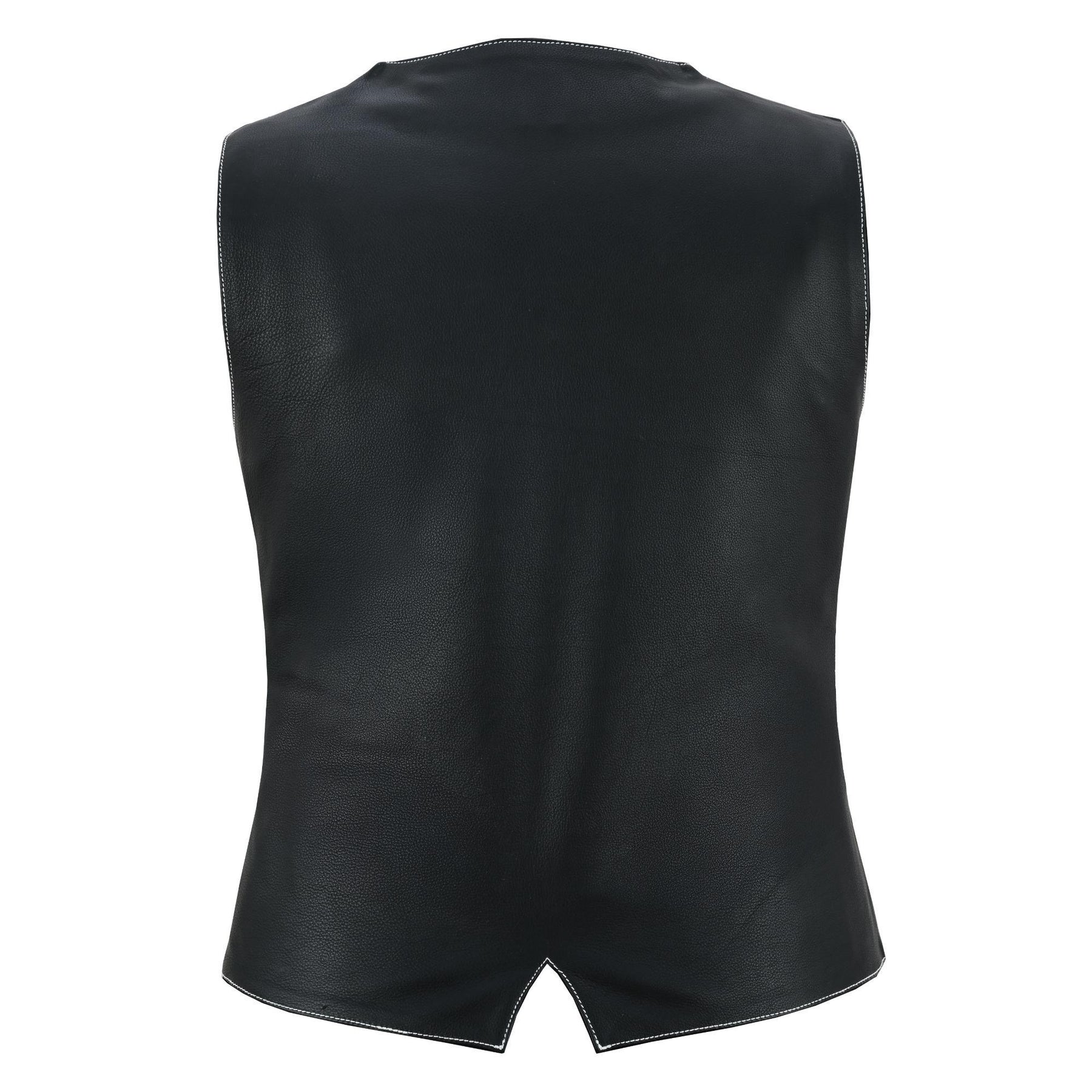 Looking for a stylish vest that combines elegance with practical features? The premium leather exterior offers a sleek, durable finish, while the soft mesh lining provides comfort and breathability. It includes stylish leather laces with metal rings for a customized fit, and high-quality white stitching adds a classic touch.