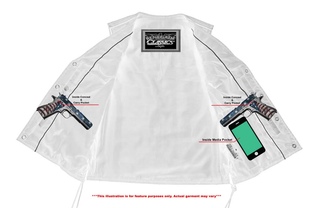 Concealed & Controlled: Two interior gun pockets with reinforced shoulder support for secure carry, plus an inside cell pocket for the essentials.