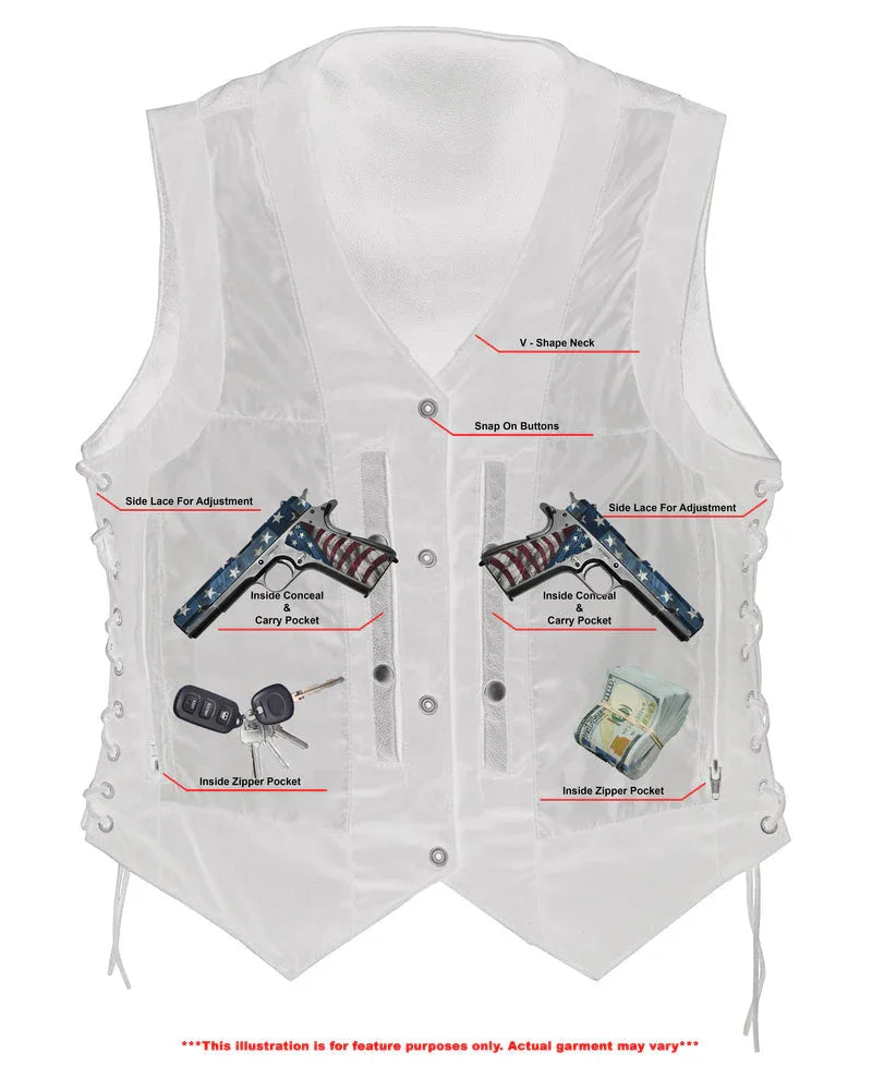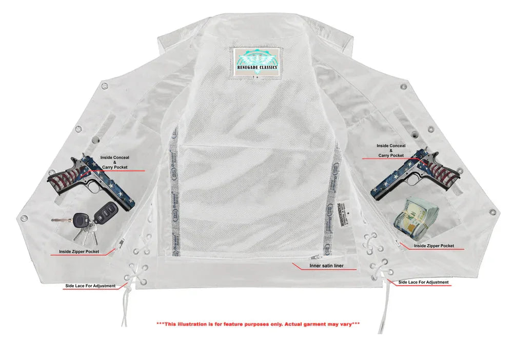 2 inside concealed gun pockets made of special heavy-duty textile with built-in holsters and snap closure.